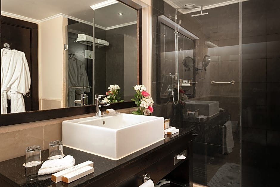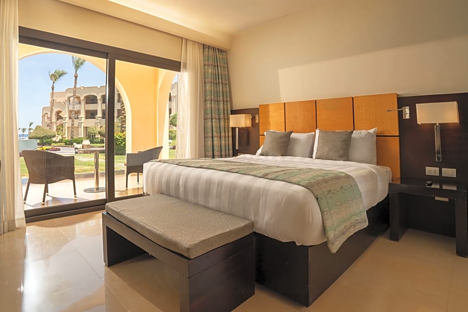 This Spacious room air-conditioned room features either a balcony or a terrace with a beachfront view. It features an electronic door locking system, satellite TV with international channels, mini-bar, tea, and coffee-making facilities, a desk with free internet access, a safe deposit box, air conditioning, comfortable beds with exquisite Egyptian cotton sheets, and two reading spot lamps. Bathrooms feature a double-head shower cabin, bidet, hairdryer, shaving mirror, bath robes, slippers, and free toiletries.